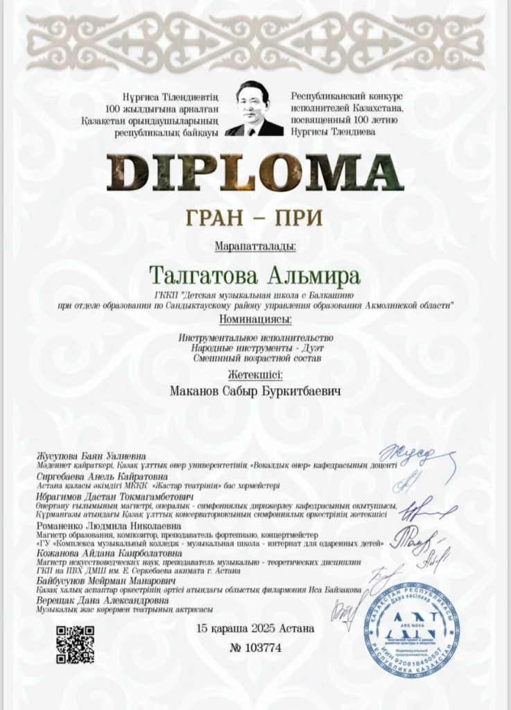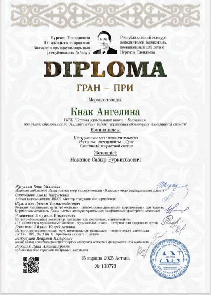 Биыл көрнекті қазақ композиторы, дирижер, домбырашы және педагог Нұрғиса Тілендиевтің туғанына 100 жыл толады. Оның жұмысы ұлттық өнерде үлкен із қалдырды. Бүгінгі таңда талантты музыканттың шығармалары жастардың дауысы. Байқау ҚР Мәдениет және ақпарат министрлігінің қолдауымен өткізіледі. Байқауға еліміздің түкпір-түкпірінен 50-ден астам адам қатысты. Сандықтау ауданының Балқаш Балалар музыка мектебінен домбыра сыныбының педагогы Мақанов Сабыр Бүркітбайұлы өз тәрбиеленушілерімен бірге Ангелина мен Талғатова Альмира өнер көрсетті. Кәсіби шеберлігі, табандылығы, табандылығы, домбырада шебер ойнауы арқасында олар ГРАН-ПРИ байқауының ең жоғары наградасына ие болды!