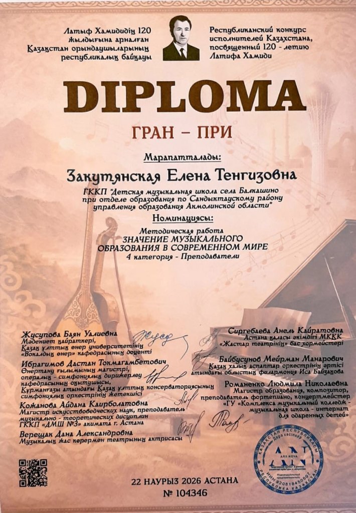 Астана қаласында 2026 жылғы 22 наурызда Латифа Хамиди атындағы республикалық байқау өтті. Байқау қорытындысы бойынша бас жүлдені ұжымдық музыка пәнінің оқытушысы Закутянская Елена Теңізқызы" Қазіргі әлемдегі музыкалық білім берудің маңызы"әдістемелік жұмыс номинациясы бойынша алды