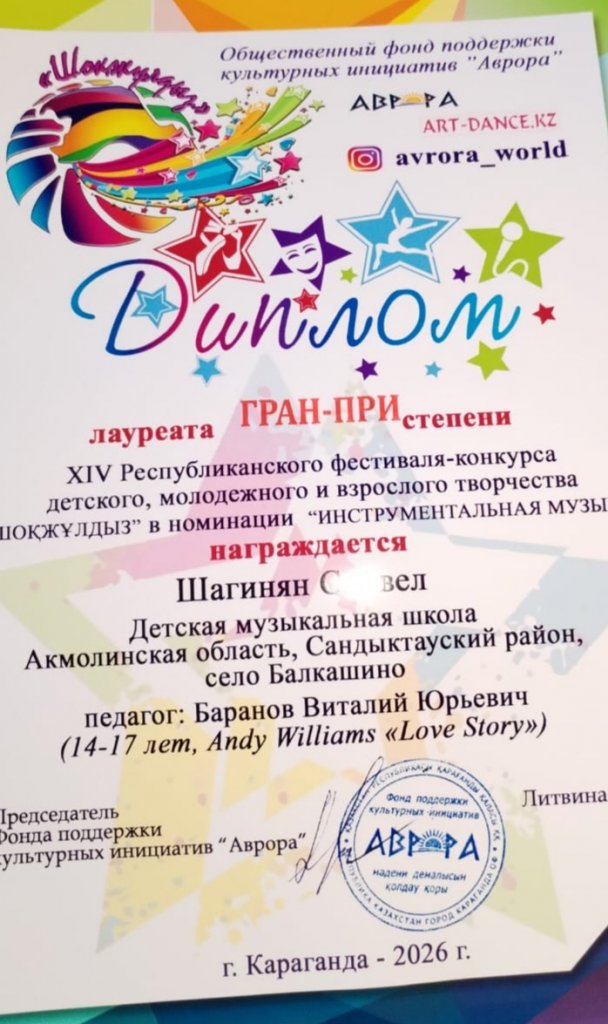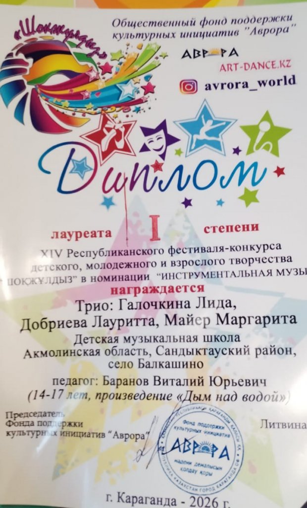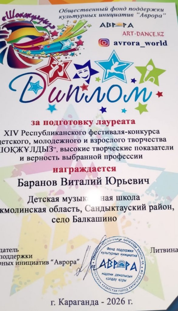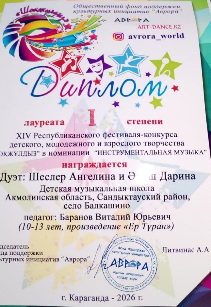 Шәкірттерімізді мақтан тұтамыз! Оқу жылы бойы мұғалім Баранов Виталий Юрьевичтің жетекшілігімен гитара сыныбы бойынша Балалар музыка мектебінің оқушылары әр түрлі деңгейдегі байқауларға белсенді қатысып, тамаша нәтиже көрсетті! 2026 жылғы 27 наурыздан 30 наурызға дейін Қарағанды "Шоқжұлдыз-2026" балалар мен жастар шығармашылығының республикалық фестиваль - байқауы өтті, "аспаптық музыка" номинациясында тамаша нәтижелер көрсетті: ЧВАНИН Полин мен Метаев дуэті Томирис ГРАН-ПРИ: соло-Шагинян Самвел I дәрежелі лауреаттар: Шеслер Ангелина мен Әліш Дарина дуэті I дәрежелі лауреаттар: трио: Галочкина Лидия, Добриева Лаурит, Майер Маргарита