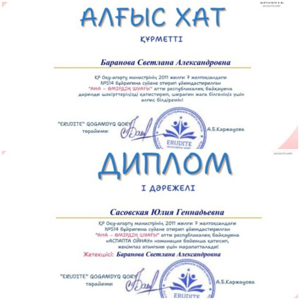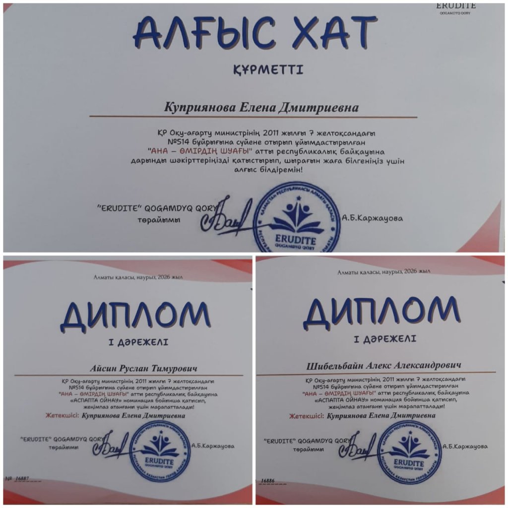 Музыка мектебінің оқушылары оқытушы Куприянова Елена Дмитриевна және Баранова Светлана Александровна Республикалық байқауға қатысты "АНА – ӨМІР ШУАҒЫ" тамаша нәтиже көрсетті! Жарайсыңдар балалар, солай ұстаңдар!